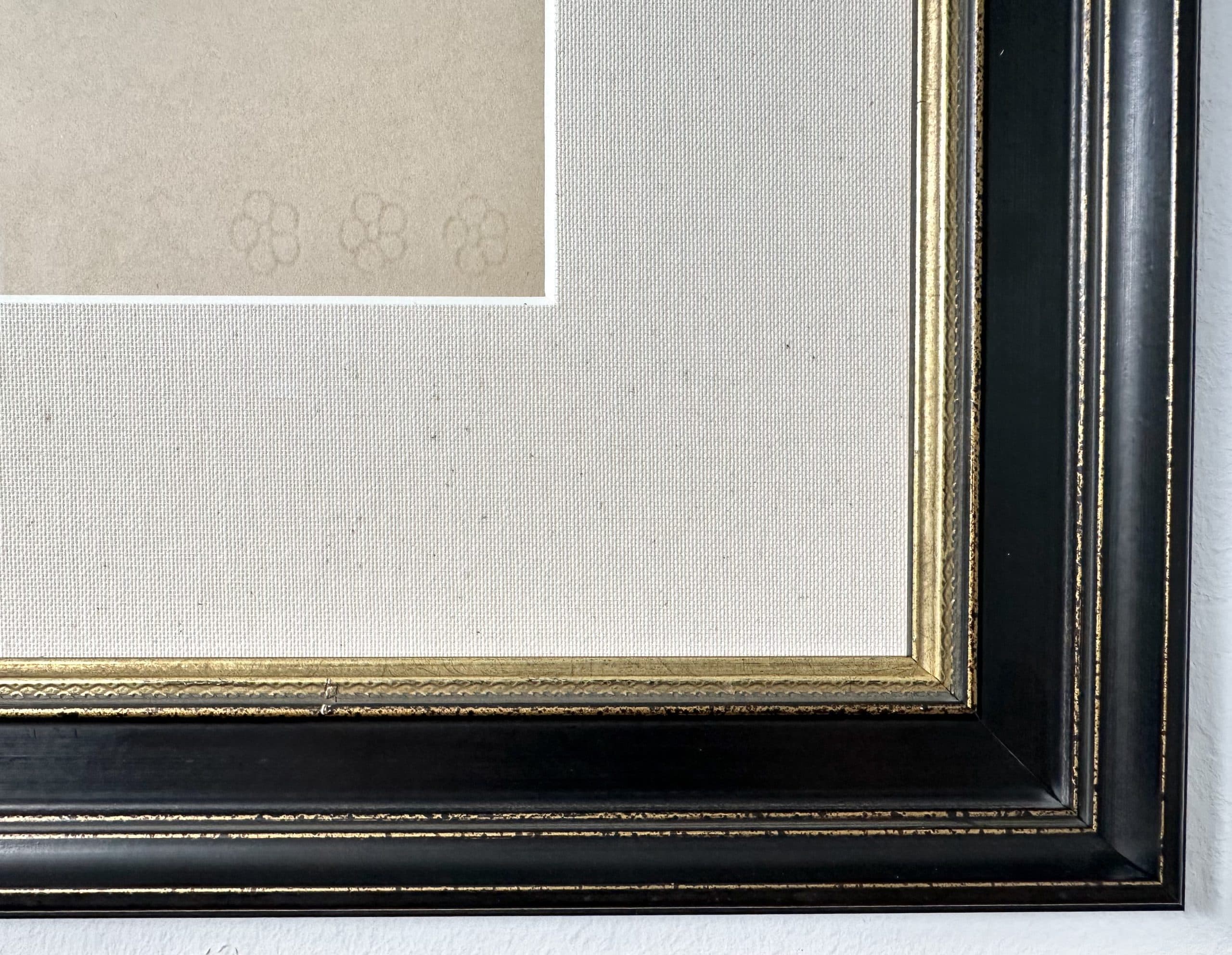 Encadré avec un passe-partout en lin et un verre muséal filtrant 99 % des UV.